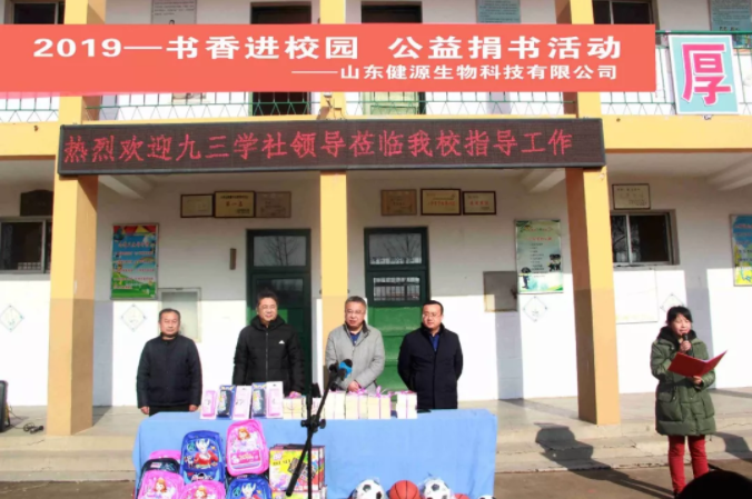 一本書傳遞一份愛,一份愛成就一個夢想,一個夢想讓無限希望起航,愛心就像一個蒲公英,和著暖陽來到了校園。元旦將至,歲寒情深,2019年12月27日,九三學社與山東健源生物科技有限公司共同為泰安市高新區化馬灣小學捐贈了一批書籍、學習用品和體育器材,為學生和老師們送去社會的關心、關懷和關愛。
