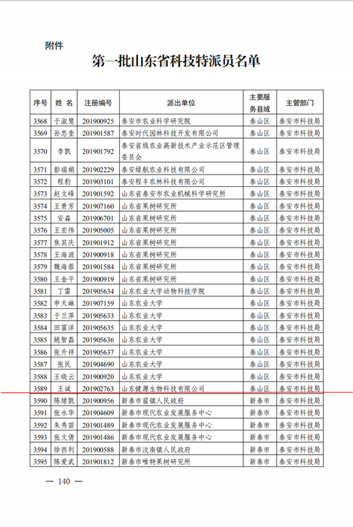 發(fā)布時(shí)間:[2020-6-22 14:58:2] 瀏覽量:3321次為深入貫徹習(xí)近平總書記對(duì)科技特派員制度推行20周年作出的重要指示精神,落實(shí)科技特派員制度推行20周年總結(jié)會(huì)議、全省科技特派員工作會(huì)議要求,按照《關(guān)于打贏脫貧攻堅(jiān)戰(zhàn)三年行動(dòng)工作方案》、《關(guān)于深入推進(jìn)科技扶貧助力鄉(xiāng)村振興若干措施》和《關(guān)于組織開展科技特派員注冊工作的通知》部署安排,進(jìn)一步加強(qiáng)科技特派員選派工作,現(xiàn)名單予以公布,山東健源生物科技有限公司董事長王誠被選任為第一批山東省科技特派員。