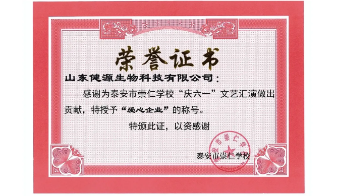 山東健源生物科技有限公司被授予“愛心企業”稱號