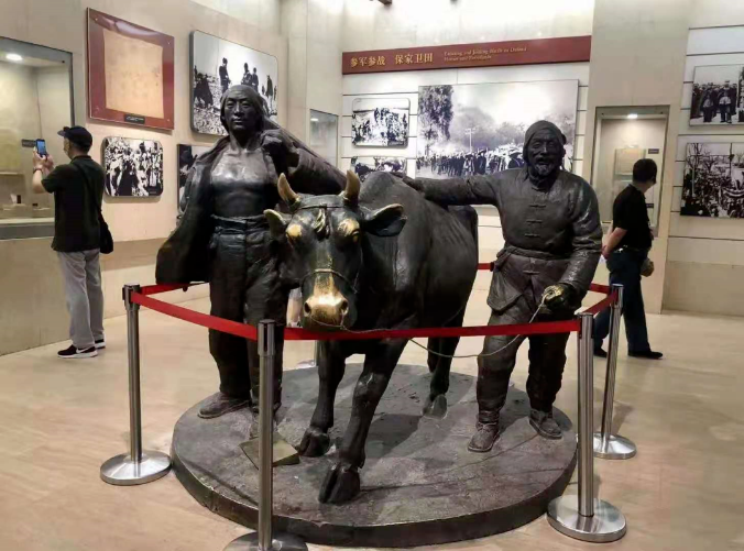 走進西柏坡紀念館,首先映入眼簾的是“新中國從這里走來”大型銅雕,老一輩革命家群像栩栩如生,堅定的姿態、磅礴的氣勢,仿佛整個都是用意志和執著鑄造的,爆發出蓬勃的力量。