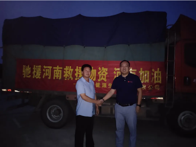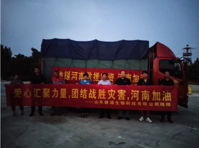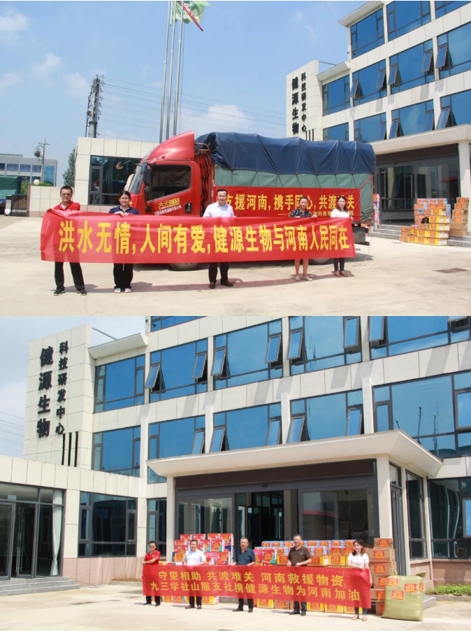 7月31日8時,救援物資發車儀式在山東健源生物寧陽工廠舉行,九三學社泰安市委劉彥濤秘書長、九三學社山東服裝學院支社侯家華主委、九三學社山東服裝學院副主委山東健源生物王誠董事長、董事長助理兼辦公室王玲主任等相關負責人出席發車儀式。