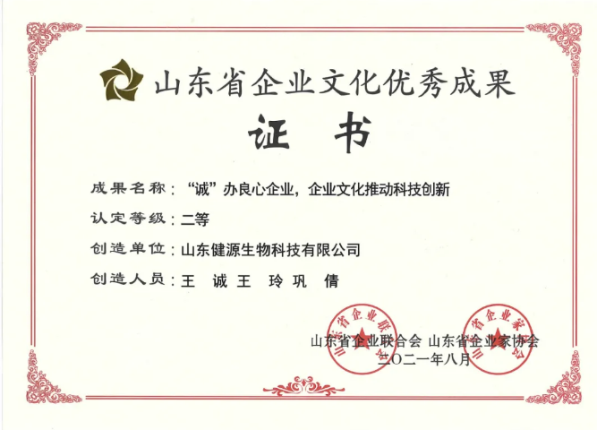 2021年8月,山東省企業聯合會、山東省企業家協會發布《關于公布首屆山東省企業文化成果的通知》,山東健源生物科技有限公司報送的““誠”辦良心企業,企業文化推動科技創新”企業文化建設成果榮獲首屆山東省企業文化成果二等獎。
