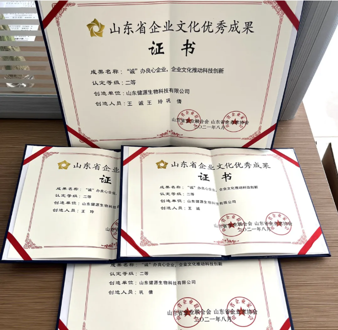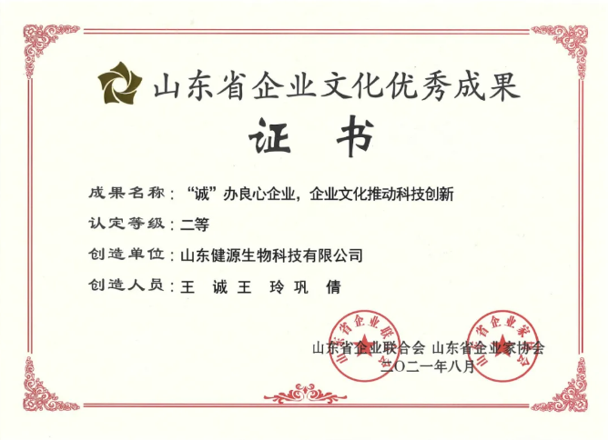 2021年8月,山東省企業(yè)聯(lián)合會(huì)、山東省企業(yè)家協(xié)會(huì)發(fā)布《關(guān)于公布首屆山東省企業(yè)文化優(yōu)秀成果的通知》,山東健源生物科技有限公司報(bào)送的““誠”辦良心企業(yè),企業(yè)文化推動(dòng)科技創(chuàng)新”企業(yè)文化建設(shè)成果榮獲首屆山東省企業(yè)文化優(yōu)秀成果二等獎(jiǎng)。
