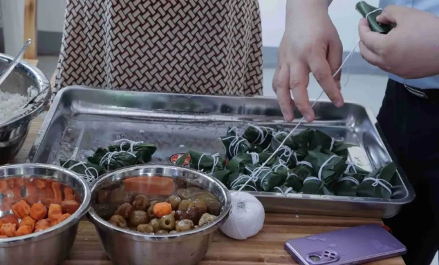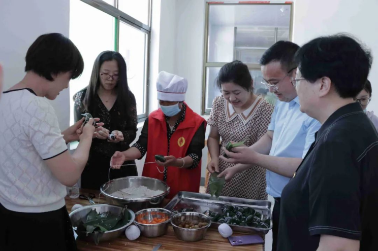 與村民共同包粽子迎端午,綠色的粽葉在大家手中上下舞動,清香的葦葉包裹真意,點綴一顆甜甜的真心,用長長的棉線牢牢捆住真情。