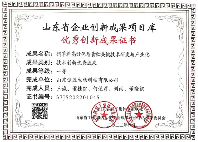 根據山東省輕工集體企業聯社發布《關于公布企業技術創新成果項目的通知 》(魯輕聯企[2022]18號),經各市中小企業主管部門、行業協會、服務機構初審,專家評審,公示和異議復核等程序,山東健源生物科技有限公司提報的《飼草優質青貯關鍵技術研發與產業化》成果榮獲山東省企業創新成果項目庫 “技術創新優秀成果一等獎”。