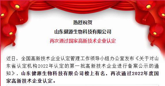 祝賀山東健源生物再次通過國家高新技術企業(yè)認定