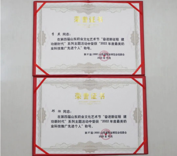 山東健源生物技術部總監李燕、外宣部主任邢燭榮獲“2022年度最美奶業科技推廣先進個人”稱號