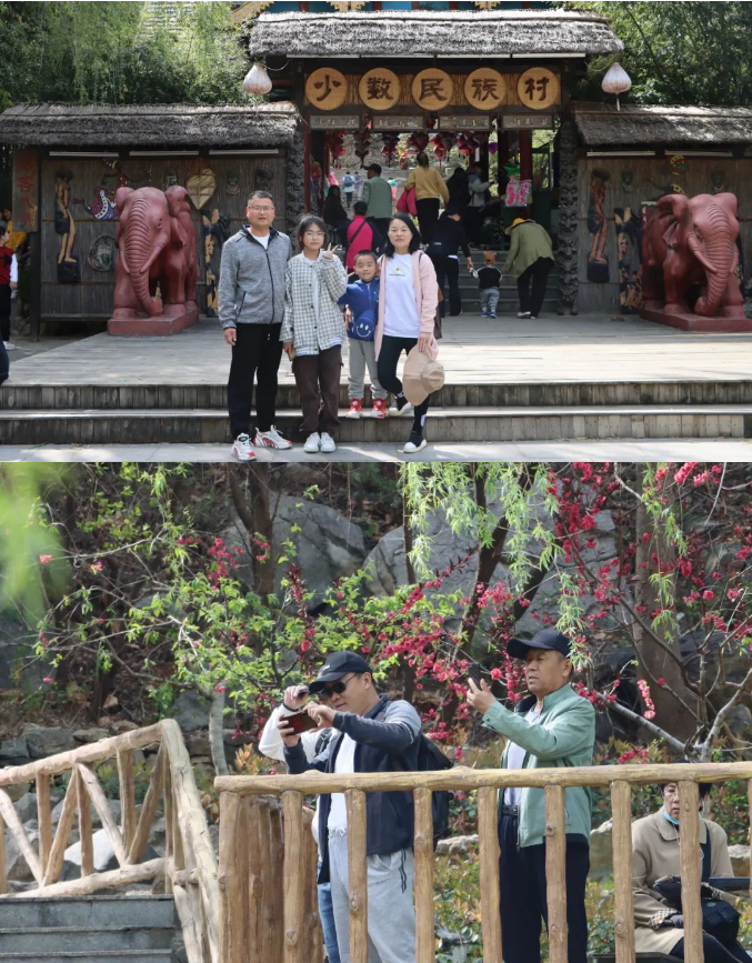 “九頂塔”分布著16個(gè)少數(shù)民族村寨,大家先后參觀了傣族、苗族、佤族、蒙古族、維吾爾族等村寨,觀看精彩的原生態(tài)民族歌舞演出并體驗(yàn)民族服飾,大家紛紛拿出手機(jī)拍照留念。