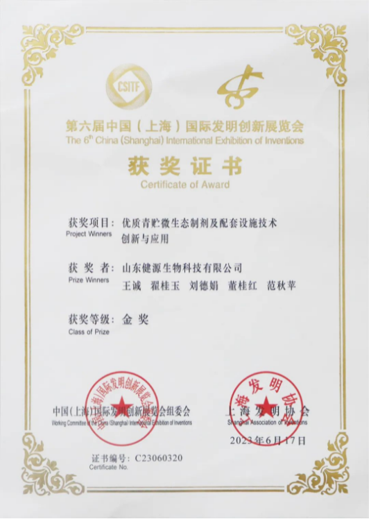 2023年6月17日,第六屆中國(上海)國際發(fā)明創(chuàng)新展覽會(huì)圓滿閉幕,頒獎(jiǎng)典禮在上海世博館隆重舉行,山東健源生物科技有限公司《優(yōu)質(zhì)青貯微生態(tài)制劑及配套設(shè)施技術(shù)創(chuàng)新與應(yīng)用》項(xiàng)目榮獲第六屆中國(上海)國際發(fā)明創(chuàng)新展覽會(huì)金獎(jiǎng)。