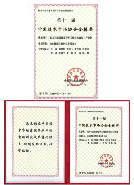 近日,“構建新發展格局,建設中國式現代化高層報告會暨第十一屆中國技術市場協會金橋獎表彰獎勵大會”在北京隆重召開,經專家評審委員會評審,山東健源生物科技有限公司《飼草料高效優質青貯關鍵技術研發與產業化》項目榮獲第十一屆中國技術市場協會金橋獎優秀項目獎。
