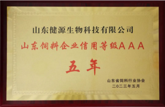 為不斷提高連續(xù)多年獲得《山東飼料企業(yè)信用等級(jí)AAA》的信用等級(jí)的含金量,山東省飼料行業(yè)協(xié)會(huì)將以每滿5年為時(shí)間段,頒發(fā)山東飼料企業(yè)信用等級(jí)AAA的榮譽(yù)證書(shū)和牌匾(2023年會(huì)上頒發(fā))。山東健源生物科技有限公司榮獲《山東飼料企業(yè)信用等級(jí)AAA》五年企業(yè)榮譽(yù)稱(chēng)號(hào)。
