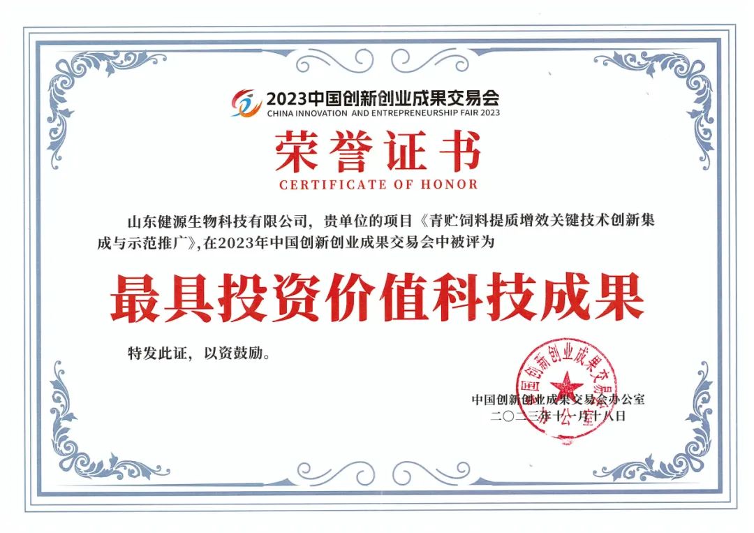 山東健源生物科技有限公司的《青貯飼料提質(zhì)增效關(guān)鍵技術(shù)創(chuàng)新集成與示范推廣》項(xiàng)目在2023年中國(guó)創(chuàng)新創(chuàng)業(yè)成果交易會(huì)中被評(píng)為最具投資價(jià)值科技成果,該獎(jiǎng)項(xiàng)的獲得充分肯定了健源生物在技術(shù)創(chuàng)新方面的卓越表現(xiàn)以及公司科技成果在市場(chǎng)應(yīng)用方面的優(yōu)秀潛力。