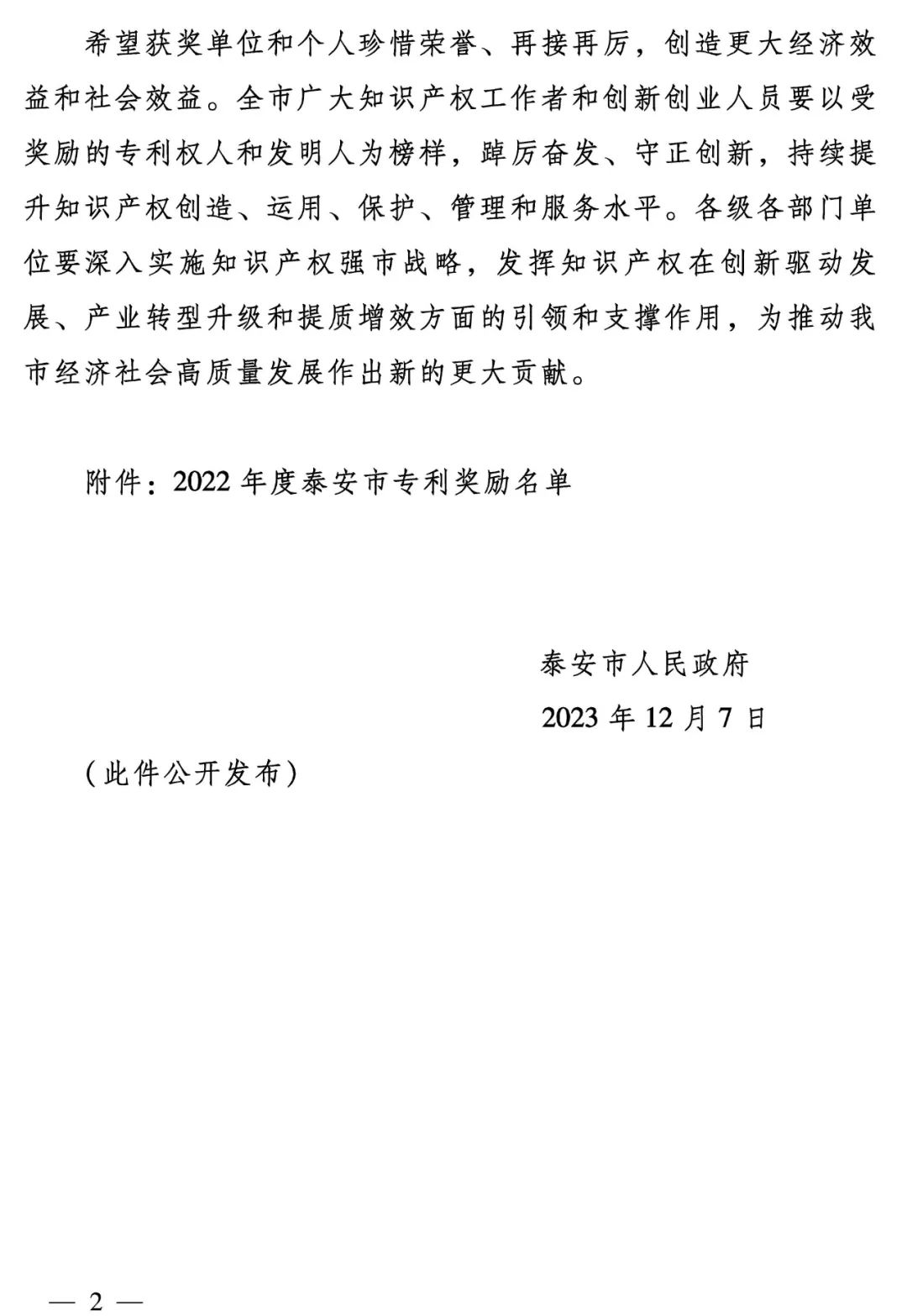 12月7日,泰安市人民政府發(fā)布關(guān)于2022年度泰安市專利獎勵的決定(泰政字【2023】74號),山東健源生物科技有限公司的“一種用于牛糞污處理的微生物添加劑及制備方法和應(yīng)用”獲全市專利三等獎。