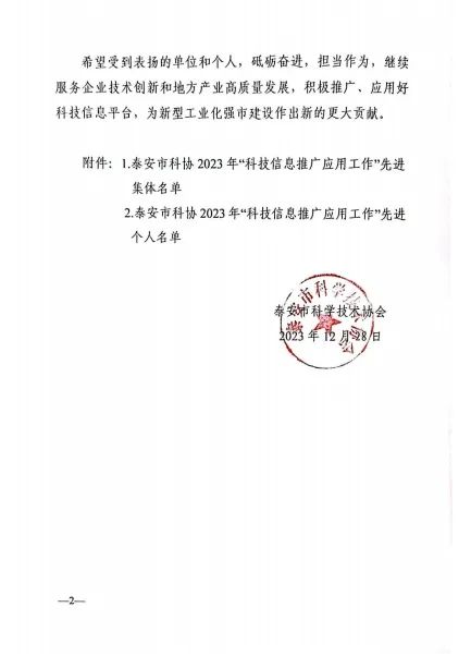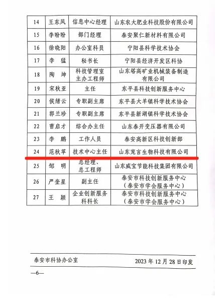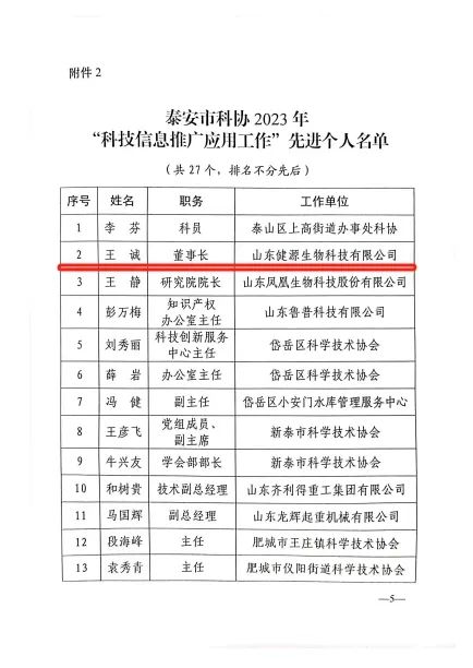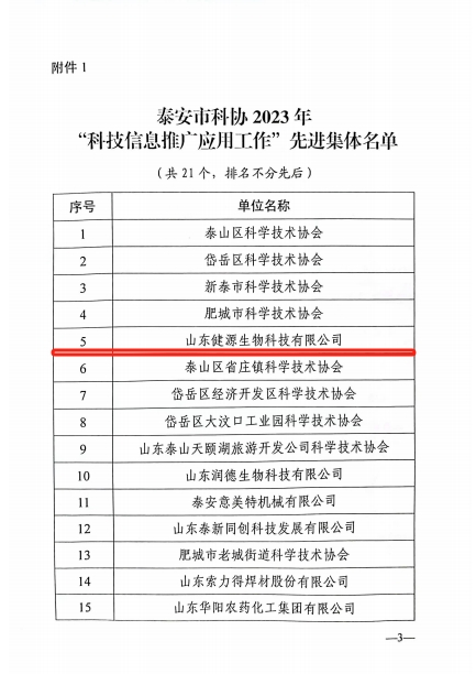 2023年12月28日,泰安市科學技術協(xié)會印發(fā)《關于表揚2023年“科技信息推廣應用工作”先進集體和先進個人的通報》,山東健源生物科技有限公司董事長王誠被評為泰安市科協(xié)2023年“科技信息推廣應用工作”先進個人,山東健源生物科技有限公司被評為泰安市科協(xié)2023年“科技信息推廣應用工作”先進集體,旗下子公司寵言生物技術中心主任范秋萍被評為泰安市科協(xié)2023年“科技信息推廣應用工作”先進個人。