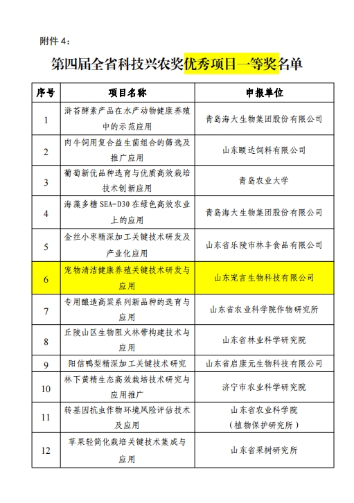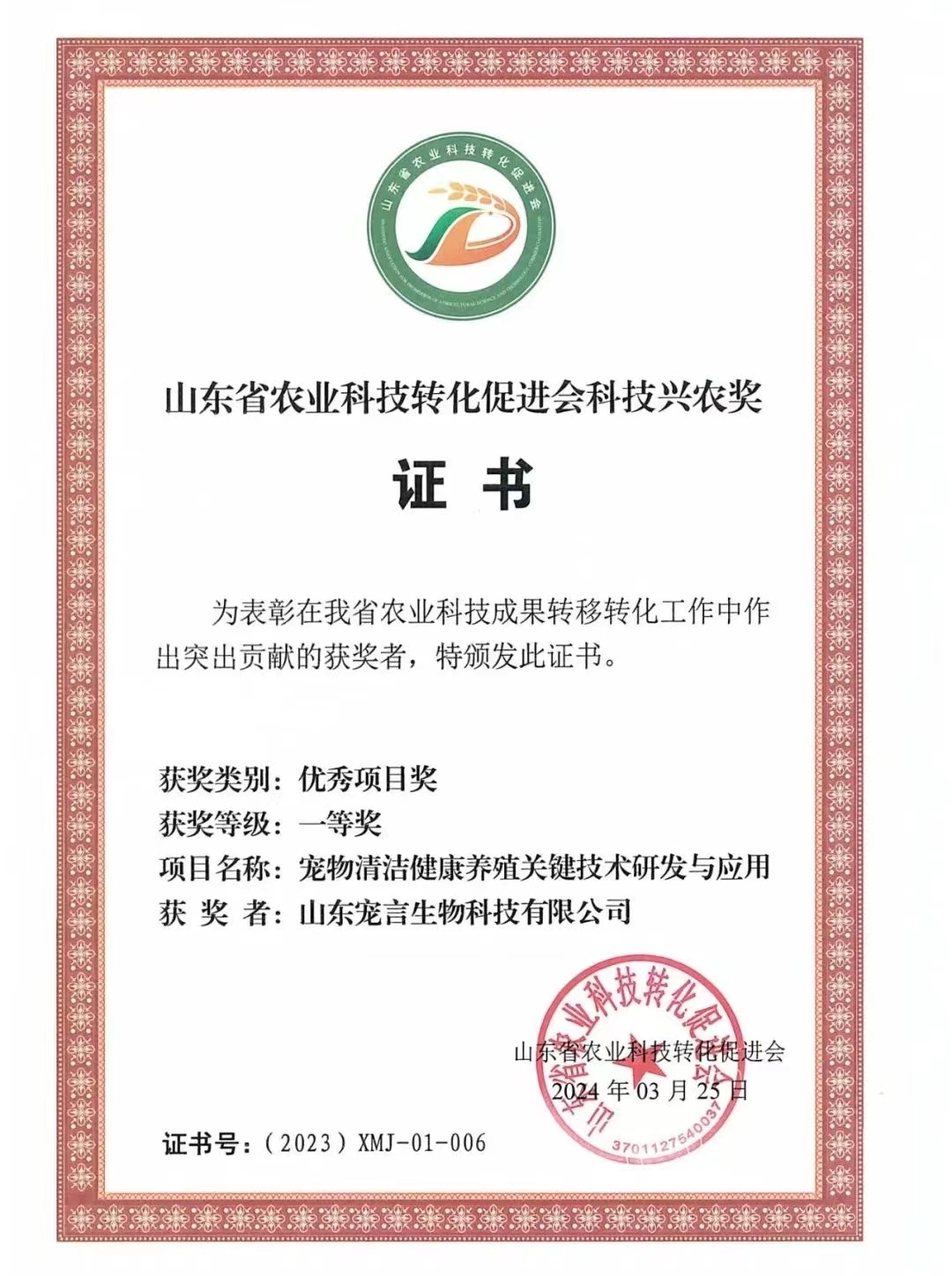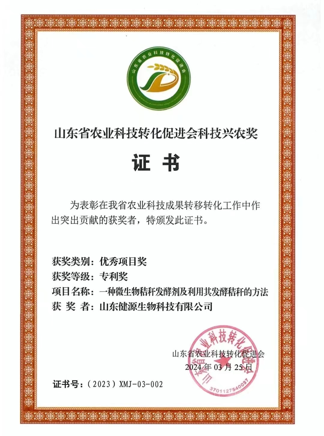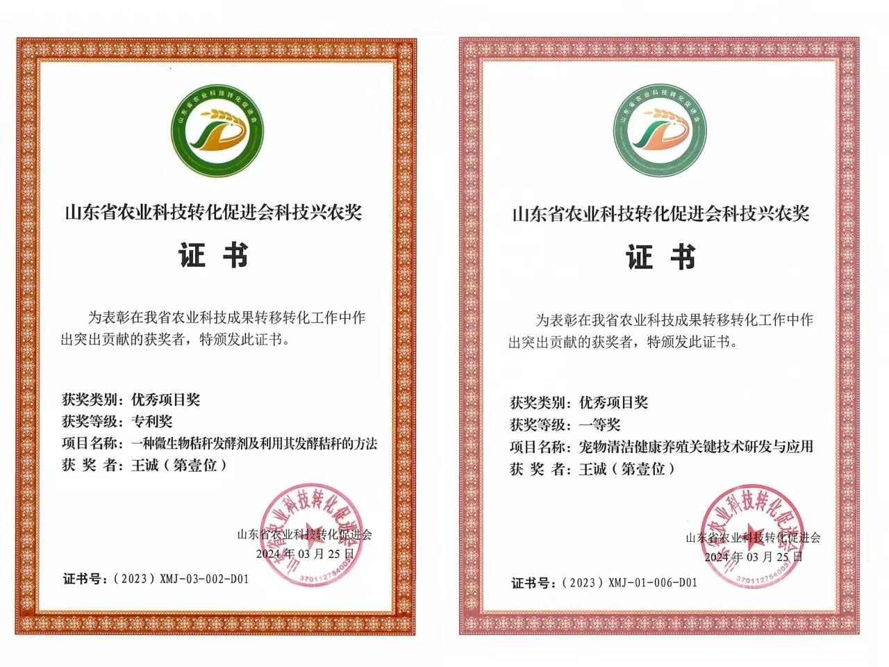 山東健源生物科技有限公司申報(bào)的《一種微生物秸稈發(fā)酵劑及其發(fā)酵秸稈的方法》項(xiàng)目獲得山東省農(nóng)業(yè)科技轉(zhuǎn)化促進(jìn)會(huì)科技興農(nóng)獎(jiǎng)優(yōu)秀項(xiàng)目獎(jiǎng)專利獎(jiǎng)。健源生物旗下子公司山東寵言生物科技有限公司申報(bào)的《寵物清潔健康養(yǎng)殖關(guān)鍵技術(shù)研發(fā)與應(yīng)用》項(xiàng)目獲得山東省農(nóng)業(yè)科技促進(jìn)會(huì)科技興農(nóng)獎(jiǎng)優(yōu)秀項(xiàng)目獎(jiǎng)一等獎(jiǎng),董事長(zhǎng)王誠(chéng)為兩個(gè)項(xiàng)目的第一完成人。