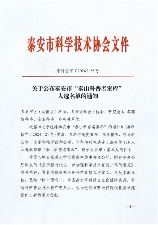 根據《關于組建泰安市“泰山科普名家庫”的通知》(泰科協字[2024]21號)要求,泰安市“泰山科普名家庫”評選工作經過材料初審、專家審核評議和公示等環節,最終,126人入選泰安市“泰山科普名家庫”。