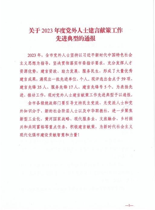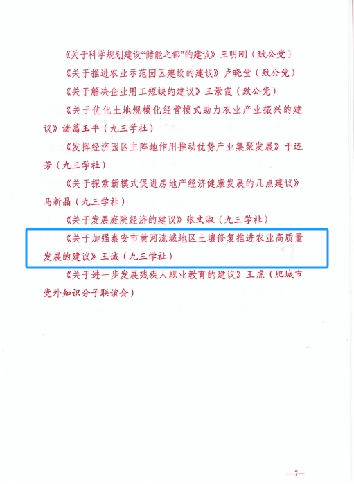 發(fā)布時間:[2024-7-9 17:52:5] 瀏覽量:3505次會上公布了《關(guān)于2023年度黨外人士建言獻(xiàn)策工作先進(jìn)典型的通報》,王誠董事長被評為2023年度黨外人士建言獻(xiàn)策“建言先鋒”,撰寫的《關(guān)于加強(qiáng)泰安市黃河流域地區(qū)土壤修復(fù)推進(jìn)農(nóng)業(yè)高質(zhì)量發(fā)展的建議》被評為2023年度黨外人士建言獻(xiàn)策“金點(diǎn)子”。