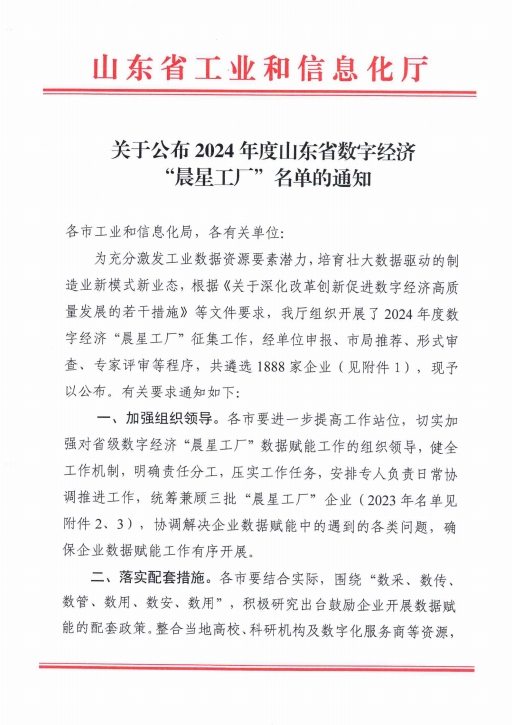近日,山東省工信廳下發《關于公布2024年度山東省數字經濟“晨星工廠”名單的通知》。經單位申報、市局推薦審查、專家評審等程序,山東健源生物科技有限公司成功入選2024年度山東省數字經濟“晨星工廠”名單。