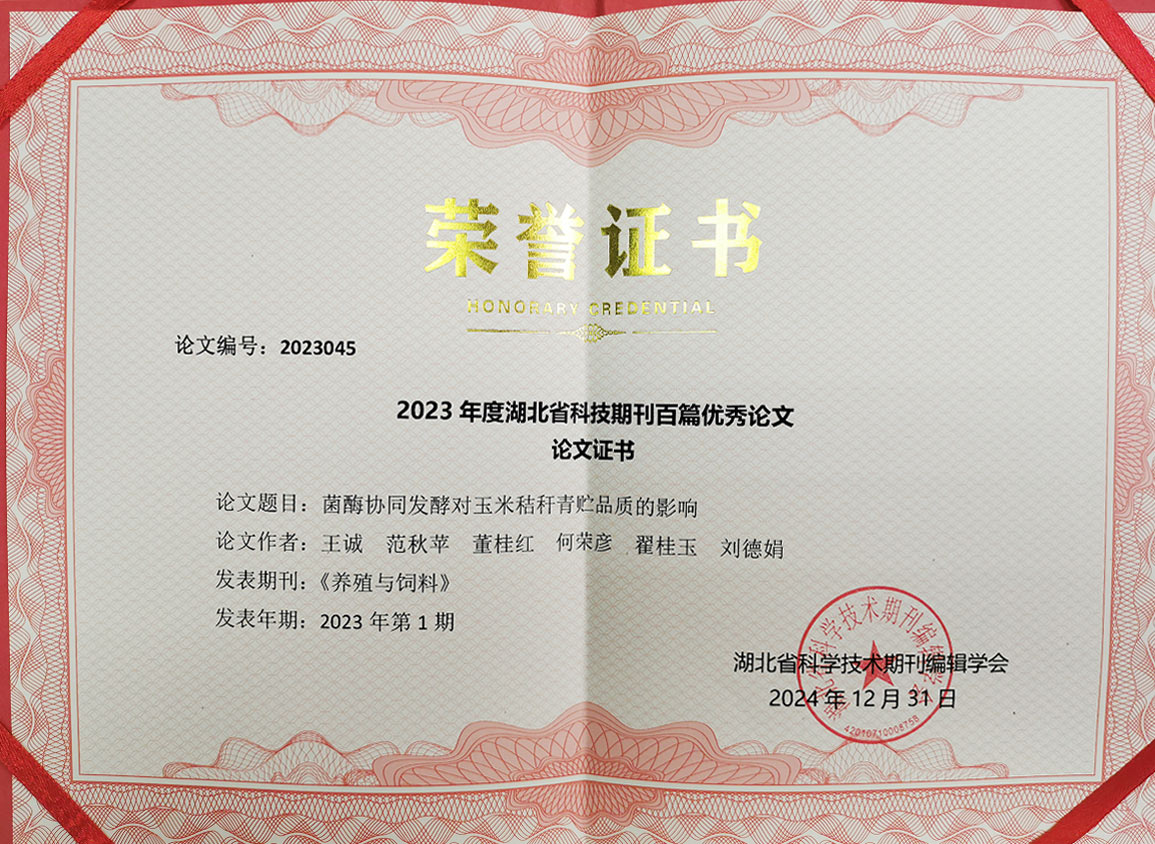 發(fā)布時間:[2025-1-15 17:6:25] 瀏覽量:2823次2024年12月31日,由湖北省科學(xué)技術(shù)協(xié)會指導(dǎo),湖北省科學(xué)技術(shù)期刊編輯學(xué)會組織實施的2023年度湖北省科技期刊百篇優(yōu)秀論文遴選結(jié)果公布,經(jīng)過評選,山東健源生物科技有限公司董事長王誠帶領(lǐng)研發(fā)團(tuán)隊撰寫的《菌酶協(xié)同發(fā)酵對玉米秸稈青貯品質(zhì)的影響》論文入選2023年度湖北省科技期刊百篇優(yōu)秀論文。