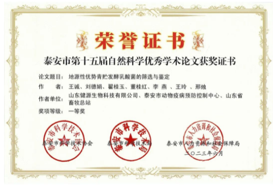 2023-7-6 山東健源生物榮獲泰安市第十五屆自然科學優(yōu)秀學術論文一等獎