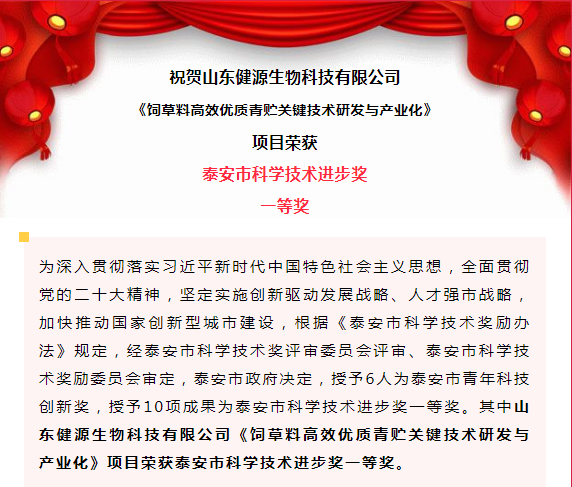 2023-4-24 山東健源生物榮獲泰安市科學技術進步獎一等獎