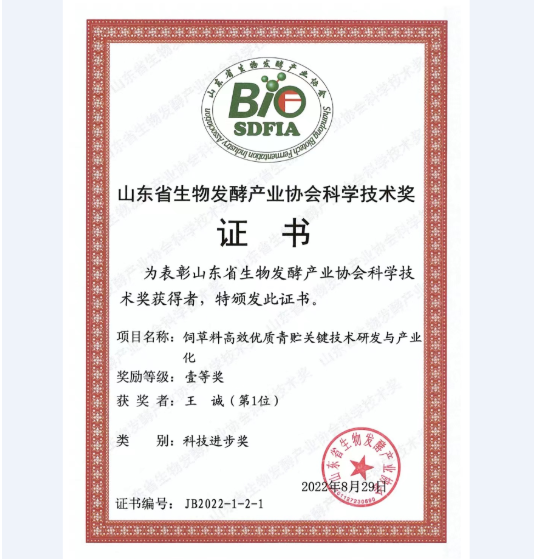 2022-11-1 祝賀山東健源生物(青貯寶)產品榮獲“2022年度創新型飼料添加劑”榮譽稱號