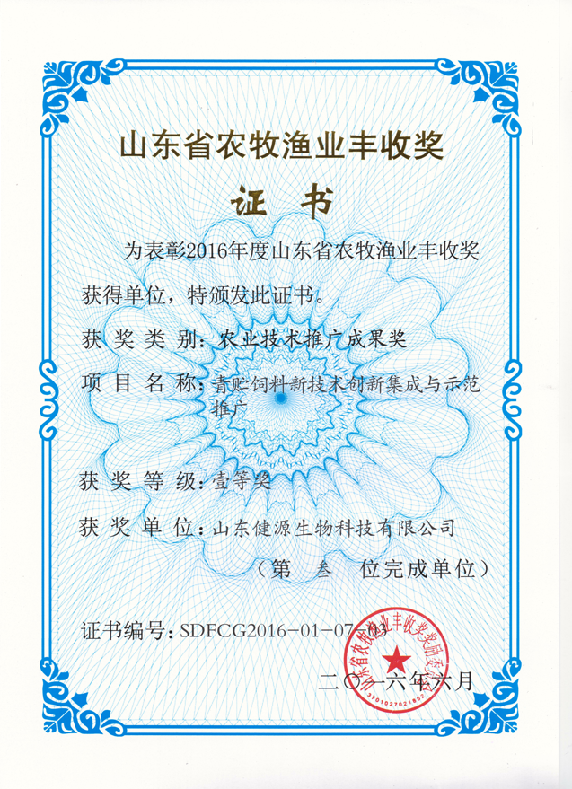 2016年8月17日,我們收到喜訊:健源生物以及公司總經理王誠分別榮獲獲得山東省農牧漁業豐收獎—...