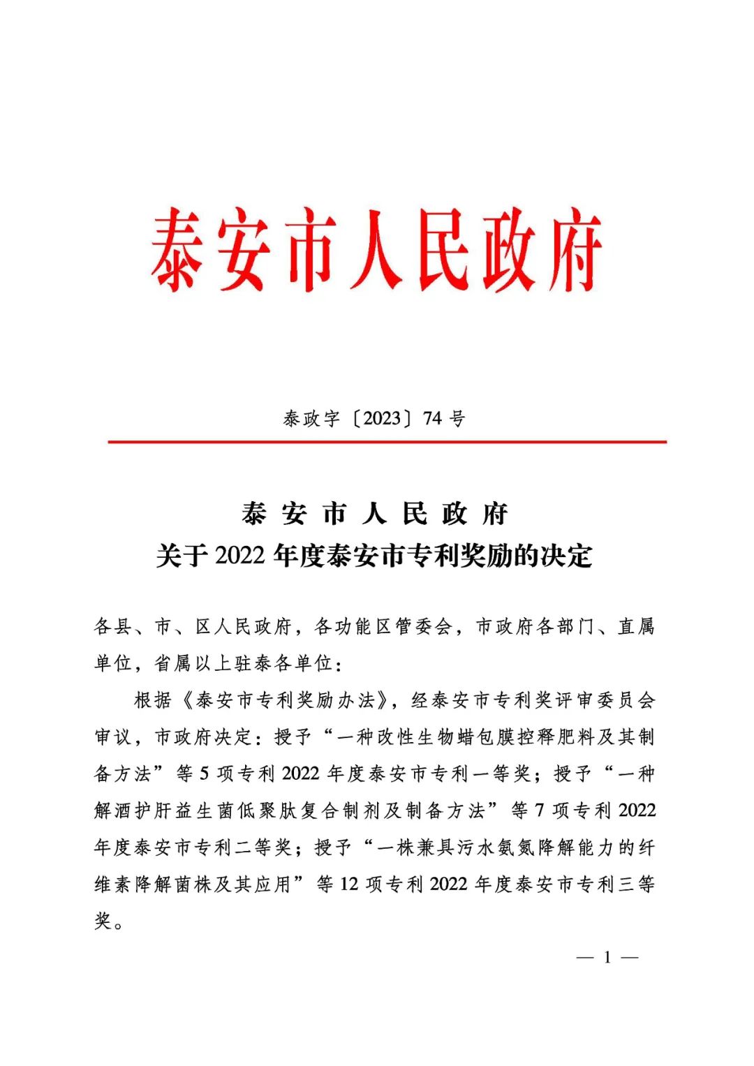 祝賀 山東健源生物科技有限公司 榮獲 2022年度泰安市專利獎 三等獎 12月7日,泰安市人民政府...