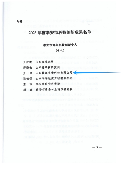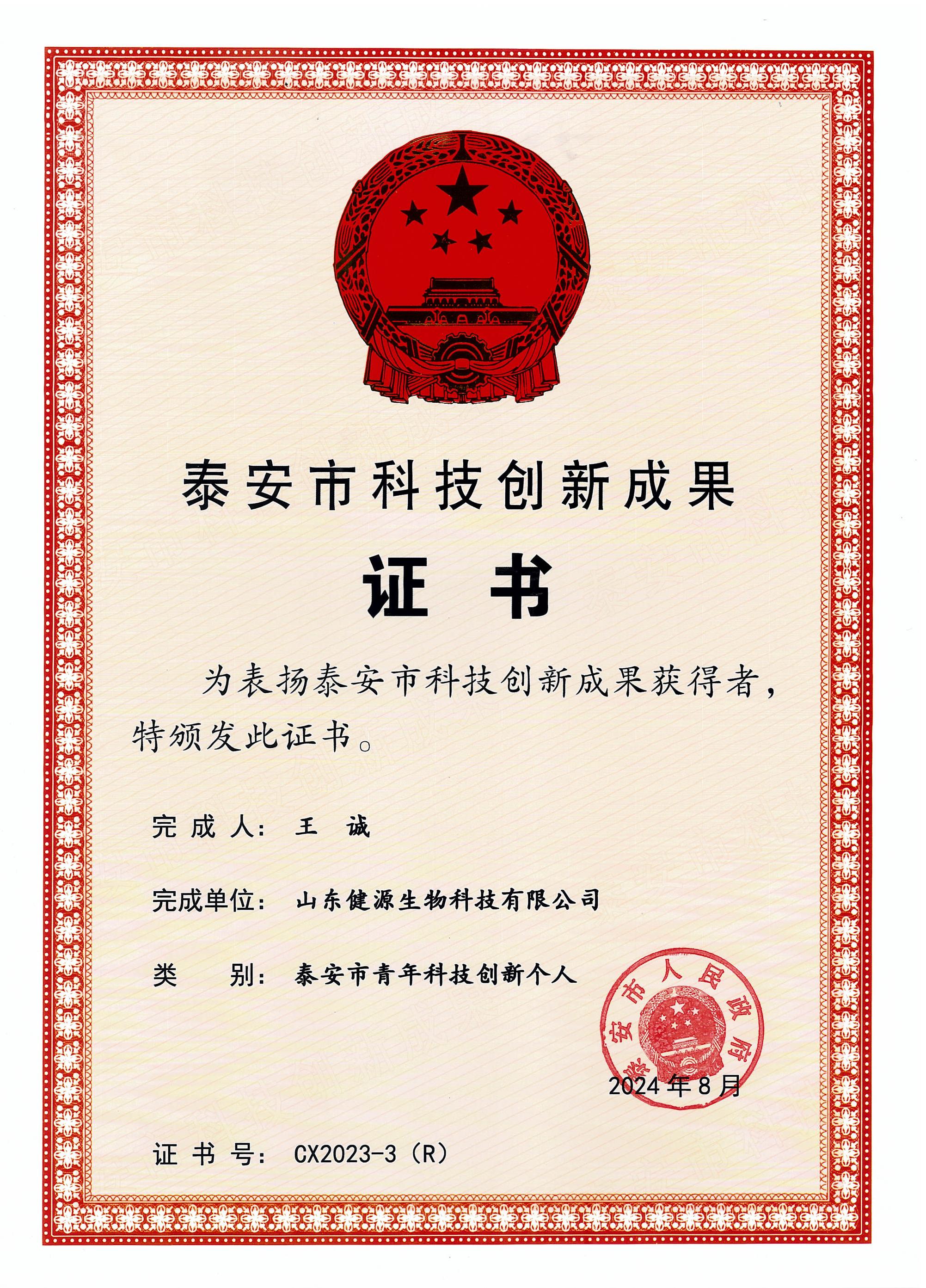 會上宣讀了《泰安市獲2023年度國家、省科學技術(shù)獎項目名單》和《泰安市人民政府關(guān)于公布2023年度泰安市科技創(chuàng)新成果名單的通知》,為2023年度省科學技術(shù)獎獲獎代表及市科技創(chuàng)新成果完成人代表頒發(fā)證書。山東健源生物科技有限公司董事長王誠榮獲泰安市青年科技創(chuàng)新個人。